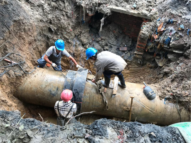 18日下午6點(diǎn),DN800管道漏點(diǎn)終被挖出,原因是兩根水泥管道連接處經(jīng)過(guò)天長(zhǎng)日久的熱脹冷縮而發(fā)生漏水??紤]到停水作業(yè)將會(huì)影響用戶的正常需求,在管道挖出后,搶修人員發(fā)揮分工協(xié)作的高效作風(fēng),一組進(jìn)行人工清理操作坑底和管上的淤泥,一組負(fù)責(zé)備料,一組關(guān)閘調(diào)水。下午7點(diǎn),材料到位,操作坑內(nèi)5名維修人員加緊手中動(dòng)作,一刻不停進(jìn)行管道清理、搶修節(jié)包裹、擰螺栓……19日凌晨,經(jīng)過(guò)14個(gè)小時(shí)的緊急搶修,DN800供水管道維修工作順利完成,主城區(qū)全面恢復(fù)正常供水。