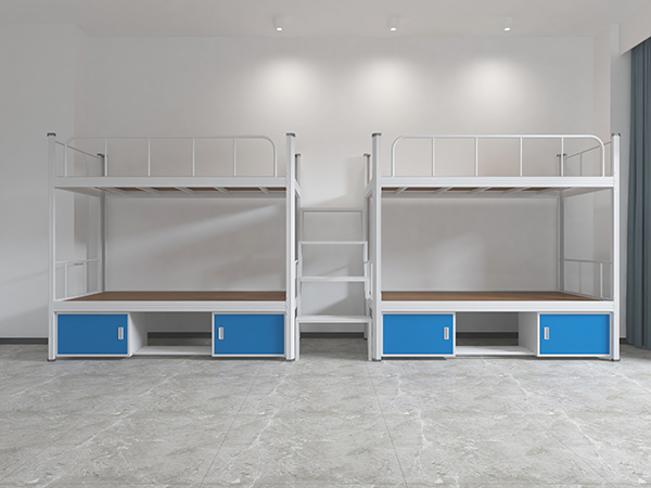 圖三中所示為帶床底柜的雙層鐵床,它與上邊幾種宿舍床的區(qū)別就在于多了一個(gè)儲(chǔ)物空間,將原本床底空出來(lái)的部分安置上了柜子,這樣無(wú)論是行李箱還是衣物,都可以放置其中,另還將原先的爬梯改造成了一個(gè)踏板樓梯,使它的安全性提高了不少。